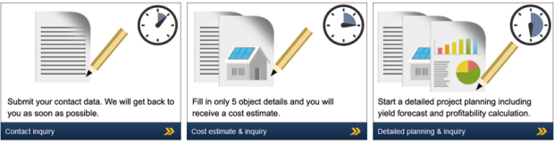 Your costumers can choose from 3 options how to get an offer: They can simply enter their contact details, have a rough project outline or, with just a few clicks, come up with an approximate evaluation of the prospects of success for the planned solar power system.