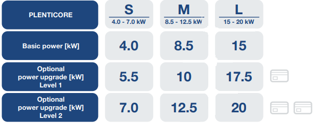 New are four power classes in the upper segment: 12.5 kW, 15 kW, 17.5 kW, and 20 kW. In total, the following power levels can be achieved with the base unit and the use of one to two PLENTICOINs: