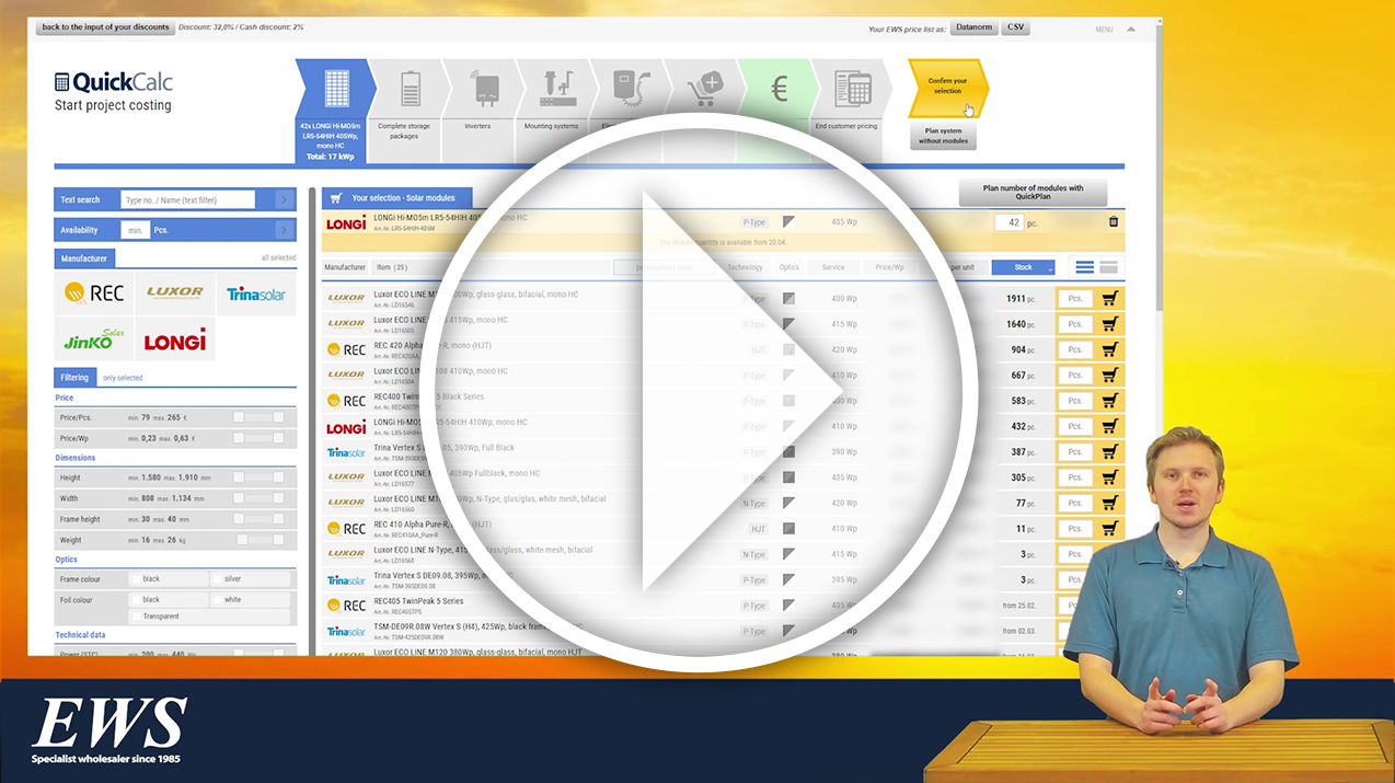 We explain in a compact video how QuickCalc 3.0 can facilitate the purchasing processes of solar companies. The focus is on filter functions and the display of product availability over time. As a wholesaler, EWS thus offers its customers unprecedented planning reliability with up to six months in advance – and, thus, the greatest possible reliability in this part of the supply chain. Of course, the new EWS system calculator can also be used to enter the shipping details, e.g., delivery on the desired date directly to the construction site or the individual calculation of freight costs.