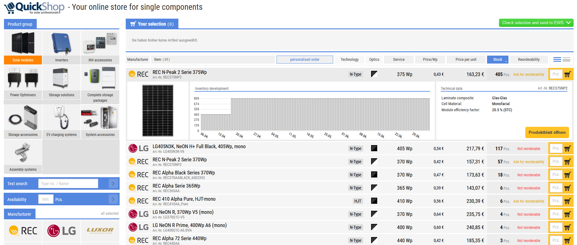 Product availability is one of the most prevalent topics in the PV industry currently (read more) and is one of our most requested to comment on, along with price and transport modalities. With our new online tool QuickShop, we now offer you personal shopping advice around the clock – and make shopping faster, more convenient and clearer for you even during times of high demand and strained supply chains.