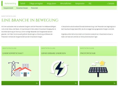 Mit QuickContent, unserem Solarstrom-Webseiten-Konfigurator, stellen wir unseren Partnern ein umfangreiches Angebot an vorgefertigten Info-Bausteinen zur Verfügung. Diese lassen sich nahtlos, bequem und kostenlos in Ihre Website einbetten – in dem von Ihnen gewünschten Design. Alle Inhalte, technischen Daten und Rahmenbedingungen werden durch uns stets automatisch aktualisiert. Das entlastet Sie, verhindert Fehlkalkulationen und vermittelt einen professionellen Eindruck.