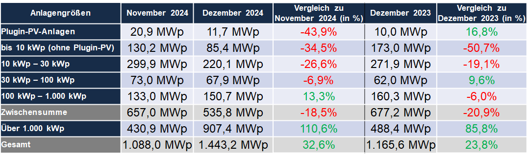 Geprägt wird der Zubau im Dezember 2024 von dem hohen Anteil der Großanlagen (über 1 MWp), auf den gut zwei Drittel der registrierten Leistung (907,4 MWp) entfallen. Die übrigen Anlagensegmente bleiben mit ca. 536 MWp hinter den Ergebnissen der vergangenen 12 Monate zurück. Besonders ausgeprägt ist der Abwärtstrend im Eigenheimbereich. Hier steht ein Minus von bis zu 50 % im Vergleich zum Vorjahreswert (Dezember 2023) zu Buche. Auch der Boom im Selbstbausegment scheint vorbei zu sein. Das Potential für hochwertige Plugin-PV-Anlagen, die im Rahmen einer individuellen Beratung vom versierten Profi verkauft werden, dürfte aber weiter riesig sein.