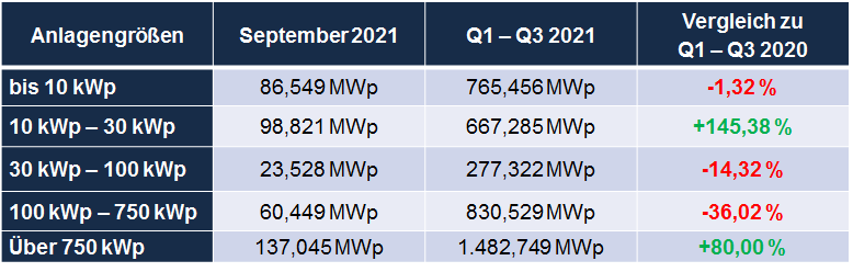 Nach Auswertung der Zahlen der Bundesnetzagentur haben die kleinen Anlagen bis 30 kWp im September 2021 leicht zugelegt. Dagegen wurde im Segment über 750 kWp deutlich weniger Leistung (44 MWp) registriert als noch im Vormonat. Da sich alle weiteren Segmente auf August-Niveau bewegen, ist der Grund für die Differenz schnell gefunden.