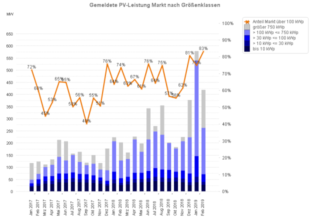 Zwar liegt dieses unter dem Januar-Wert von knapp 550 MWp (in den Daten der Bundesnetzagentur korrigiert von 579 MWp). Im Vergleich zum Februar 2018 (202 MWp) hat sich die neu registrierte Leistung jedoch mehr als verdoppelt. Insgesamt wurden nun bereits in drei aufeinanderfolgenden Monaten Topwerte von über 350 MWp erreicht. Dieser Anstieg fällt zeitlich mit den im Dezember 2018 beschlossenen Sonderabsenkungen für PV-Anlagen von 40 bis 750 kWp zusammen.