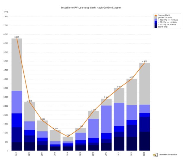 Insgesamt summiert sich der Bruttozubau der EEG-geförderten Photovoltaik-Anlagen in 2022 bisher auf 4,906 GWp – das sind rund 880 MWp bzw. ein Fünftel mehr als 2021.
