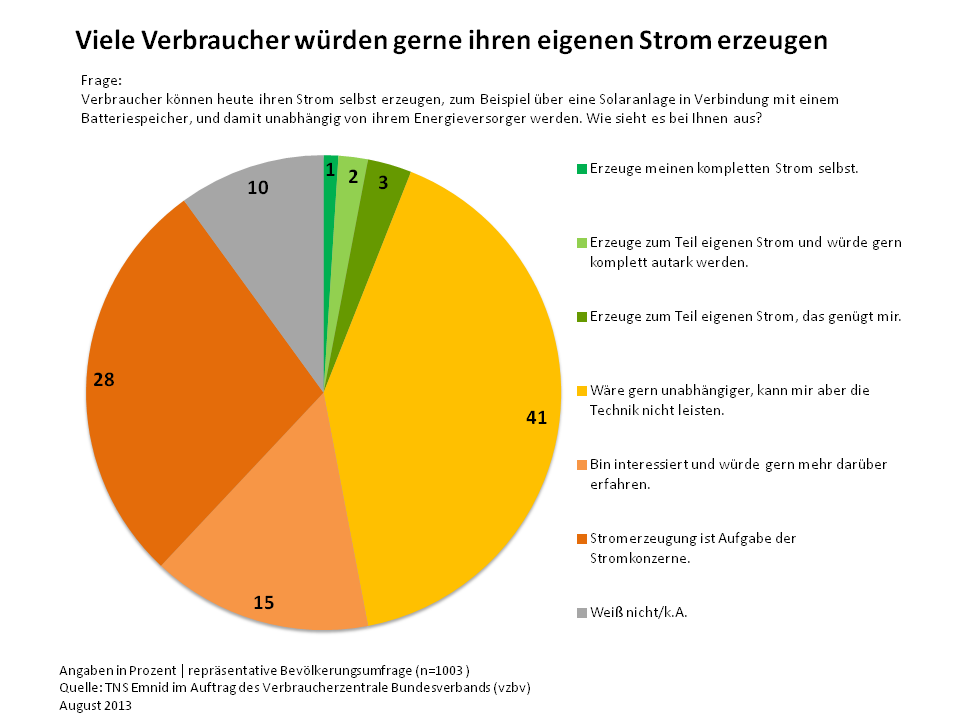 Laut einer TNS Emnid-Studie produzieren inzwischen 6 % der Deutschen ihren eigenen PV-Strom. Weitere 41 % sind grundsätzlich daran interessiert, ihren eigenen Strom zu erzeugen.