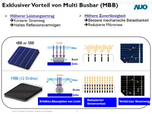 Bei der Neuentwicklung greift unser Modullieferant auf die innovative Multi-Busbar-Technologie zurück: Anstatt der üblichen vier oder fünf Busbars sind die Zellen mit zwölf Drähten ausgestattet. Dies ermöglicht einen höheren Leistungsertrag dank des kürzeren Stromwegs und des hohen Absorptionsvermögens des Lichts. Aufgrund der besseren mechanischen Belastbarkeit steigt zudem auch die Zuverlässigkeit der Module. Dies zeigen umfangreiche AUO-Tests, welche weit über die IEC-Standards hinausgehen.