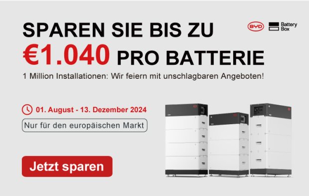 Wir freuen uns, Ihnen die BYD PowerUp Aktion vorzustellen: Im Aktionszeitraum vom 01. August bis zum 13. Dezember 2024 erhalten Sie auf jedes bei uns abgenommene BYD Battery-Box Premium HVM-Speichermodul einen Sofort-Rabatt in Höhe von 130 €.