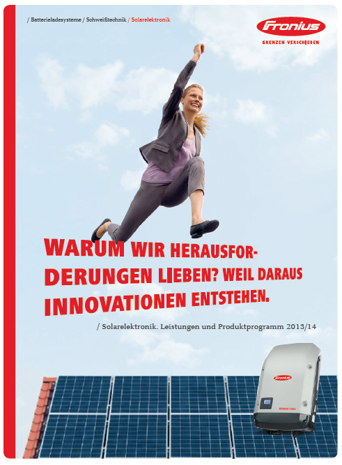 - Die hochwertige Produktbroschüre 2013/2014 bietet eine Übersicht über das gesamte Produkt- und Leistungsprogramm von Fronius inklusive der technischen Daten aller Produkte. Diese kann als Printversion angefordert werden (max. 3 Exemplare pro Vertriebspartner). Bitte wenden Sie sich hierfür an Ihren Kundenberater.