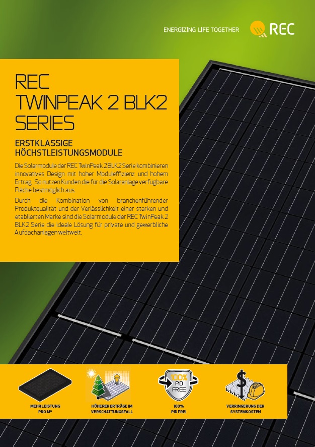Neu bei REC: Unser langjähriger Modullieferant hat seine TwinPeak-Serie um eine Fullblack-Variante ergänzt. Die Besonderheit der TwinPeak 2 BLK2 ist die eigens für diese Serie produzierte vollschwarze polykristalline PERC-Halbzelle.