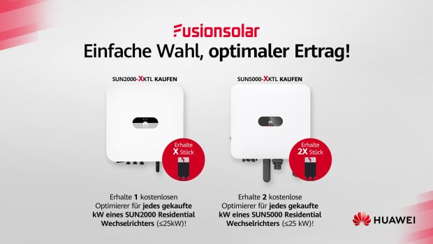 Bei Kauf eines Huawei FusionSolar Wechselrichters bis 25 kW erhalten Sie im Aktionszeitraum bis zum 13. Dezember 2024 außerdem einen SUN2000 Optimierer pro Kilowatt Wechselrichter-Leistung gratis dazu.