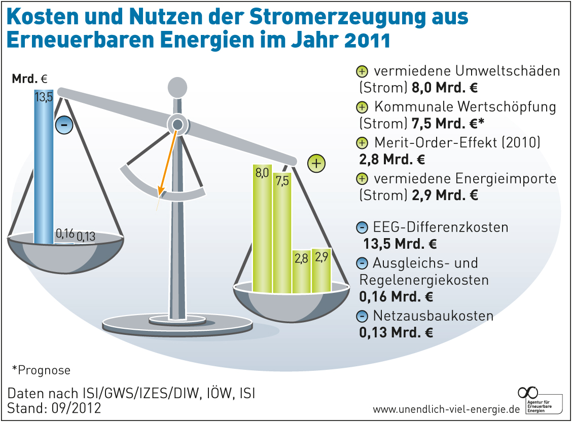 Eine vom Bundesumweltministerium geförderte Studie bestätigt, dass der Nutzen Erneuerbarer Energien die Kosten bei weitem übersteigt. So sind 2011 die positiven wirtschaftlichen Effekte sowie die für Klima und Umwelt mit 21 Milliarden Euro beziffert worden.