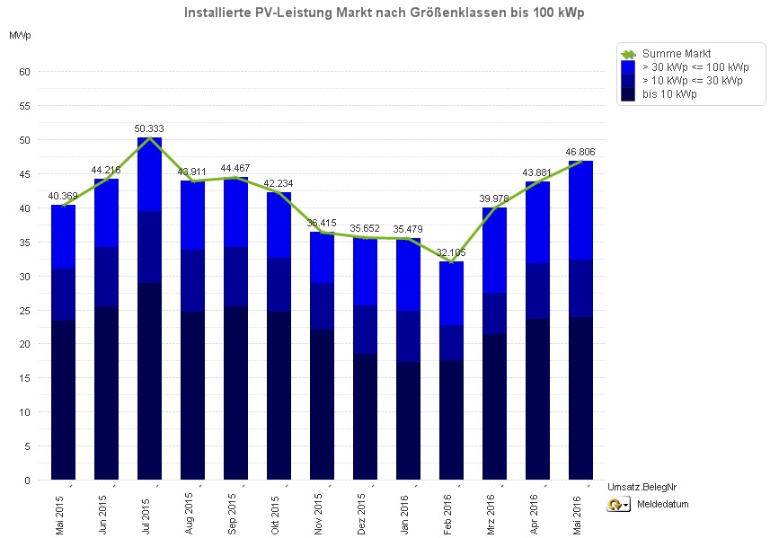 Stabil, wenn auch ausbaufähig, zeigte sich dabei das Anlagensegment bis 100 kWp. Im Vergleich zum Vorjahresmonat (Mai 2015) ist ein leichter Aufwärtstrend zu beobachten, insbesondere bei der Anlagengrößen von 30 - 100 kWp.