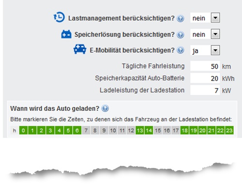 Dafür muss nur die tägliche Fahrleistung des Elektroautos sowie die Zeiten angegeben werden, in denen es sich an der Ladestation befindet. Optional können die voreingestellten Parameter Speicherkapazität (in kWh) sowie die Leistung der Ladestation (in kW) angepasst werden, um die Berechnung so genau wie möglich zu machen.