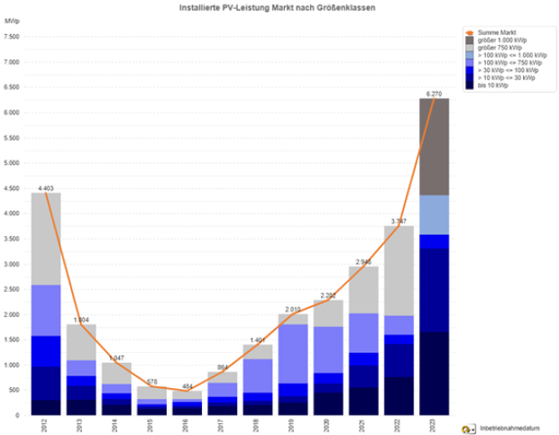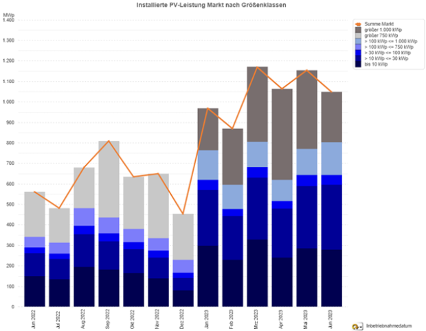 In Deutschland sind nach Zahlen der Bundesnetzagentur (Stand: 20. Juli 2023) im ersten Halbjahr Photovoltaik-Anlagen mit einer Leistung von 6270 Megawatt zugebaut worden. Seit März liegt der monatliche Zubau konstant über einem Gigawatt. Im Juni sind 1046,8 Megawatt an Photovoltaik-Leistung in Deutschland hinzugekommen. Dies ist bisher der zweithöchste Wert in diesem Jahr. Die Ein-Gigawatt-Marke wurde damit bereits zum vierten Mal in diesem Jahr übertroffen.