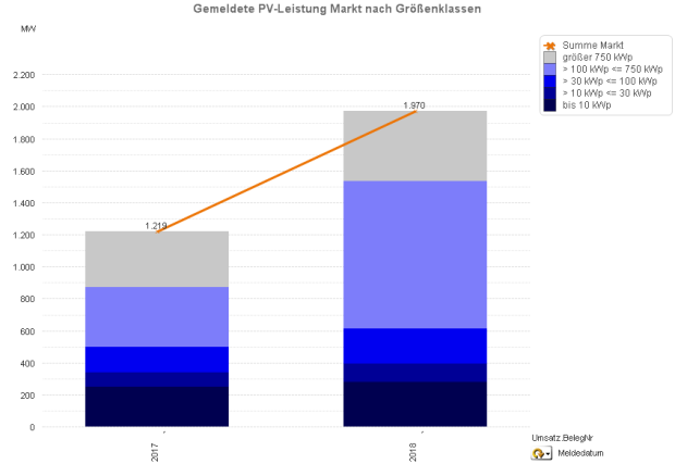 In den ersten acht Monaten dieses Jahres wurden damit ca. 1.970 MWp zugebaut. Dieser Wert übertrifft bereits jetzt die Leistung, die im gesamten vergangenen Jahr (1.750 MWp) neu installiert wurden. Im Vergleich zum Vorjahreszeitraum (1.219 MWp) bedeutet dies ein Plus von über 60 Prozent.