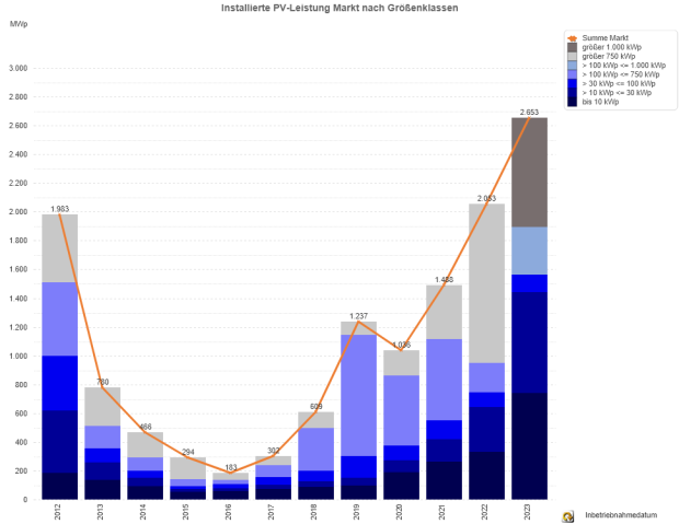 Vergleicht man den neu registrierten Zubau für jeweils das 1. Quartal, wurde 2023 mit 2,653 GWp ein neuer Rekordwert aufgestellt, wie die folgende Grafik zeigt. Insgesamt bedeutet dies ein Plus von ca. 30 % im Vergleich zum Vorjahreszeitraum, als der Zubau noch bei 2 GWp lag.