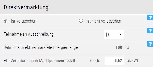 - Neu ist eine Eingabemaske für den Wert der anderweitigen Vermarktung pro Kilowattstunde, beispielsweise im Rahmen eines Stromverkaufs an Dritte.