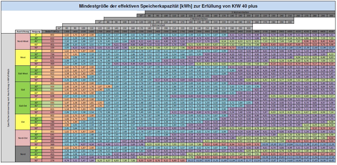 Die Mindestgröße einer geplanten PV-Anlage bzw. eines Speichersystems richtet sich nach der Anzahl der Wohneinheiten und der Gebäudenutzfläche (in m²).