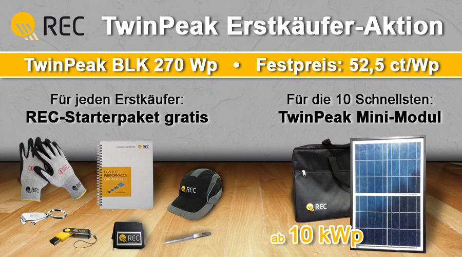 Neben einem attraktiven Einführungspreis für das TwinPeak BLK, 270 Wp (Ausführung: schwarzer Rahmen, weiße Rückseitenfolie) erhält jeder Erstkäufer gratis ein umfangreiches REC-Starterpaket. Die schnellsten Besteller von insgesamt mindestens 10 kWp sichern sich zusätzlich ein TwinPeak Mini-Modul.