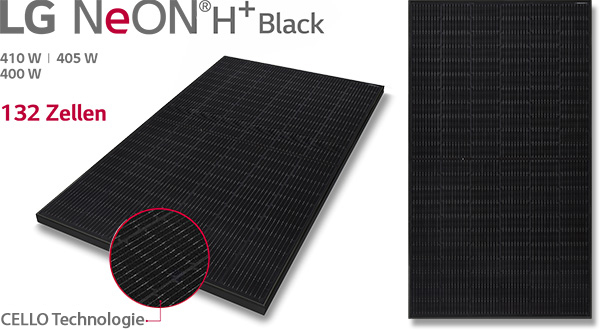 Ein Plus in Design und Leistung: Das verspricht das neue NeON H+ Black Mono-Solarmodul von LG Solar mit einer Leistung von bis zu 410 Wp. Der Neuzugang der NeON-Serie mit dem Plus glänzt mit einem lückenlos schwarzen Design, inklusive dünner Zellverbinder und einem schwarz eloxierten Rahmen. Die 132 mit CELLO-Technologie verbundenen Zellen sehen dabei nicht nur gut aus, sondern liefern mindestens 400 Wp Leistung.