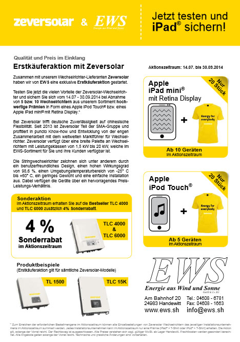 Unter dem Motto Qualität und Preis im Einklang steht unsere exklusive Zeversolar-Erstkäuferaktion, die wir Ihnen im Rahmen eines Sondermailings im Juli 2014 vorgestellt hatten. Aufgrund des großen Interesses haben wir die Aktion noch einmal verlängert. Testen Sie noch bis zum 30.09.2014 die vielen Vorteile der Zeversolar- Wechselrichter und sichern Sie sich bei Abnahme von fünf bzw. zehn Wechselrichtern aus unserem Sortiment hochwertige Prämien in Form eines Apple iPod Touch® bzw. eines Apple iPad mini® mit Retina Display. Zudem erhalten Sie im Aktionszeitraum auf die Bestseller TLC 4000 und TLC 6000 zusätzlich 4 % Sonderrabatt.