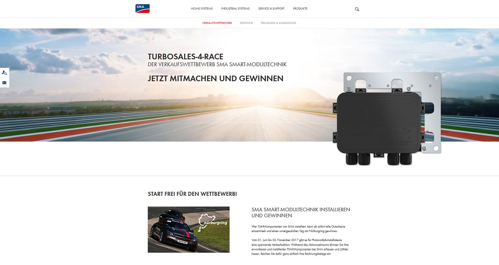 Mit der einträglichen Verkaufsaktion TurboSales-4-Race rückt SMA seine TS4-R Smart-Modultechnik in den Vordergrund. Mit der innovativen TS4-R-Plattform lässt sich erstmalig jedes einzelne Solarmodul flexibel mit einer Zusatzfunktion ausstatten – und dies einfach und kostengünstig. Während des Aktionszeitraums vom 1. Juni bis 30. November 2017 können teilnehmende Solarteure ihre erworbenen und installierten TS4-R-Komponenten bei SMA registrieren und von attraktiven Vorteilen profitieren.