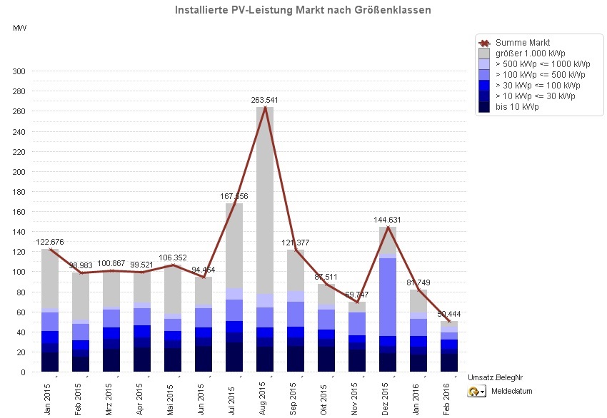 Mit knapp 50,5 MWp neu installierter PV-Leistung liegt der Februar-Zubau deutlich unter dem Vormonat (Januar 2016: 81,7 MWp). Im Vergleich zum Februar 2015 (98,983 MWp) bedeutet dies ein Minus von fast 50 %.