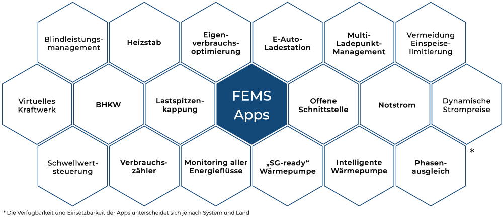 Trotz der vielen Möglichkeiten halten der bewährte Plug-and-Play-Aufbau, der hohe Vorfertigungsgrad und eine digitale Inbetriebnahme die Installationszeit bei der Ein-Personen-Montage so gering wie möglich und machen die Sektorenkopplung direkt nutzbar. Und wenn es später etwas mehr Kapazität sein soll, können Sie auch nachträglich zusätzliche Speichertürme unkompliziert in die bestehende Infrastruktur einbinden – für ein Gesamtsystem aus einer Hand. Mehr als eine Hand brauchen NutzerInnen auch nicht für die Steuerung ihrer Batterien. Das FENECON Energie Management System, kurz FEMS, liefert eine Vielzahl von Apps für optimale Kontrolle und Überblick, darunter zum Beispiel: