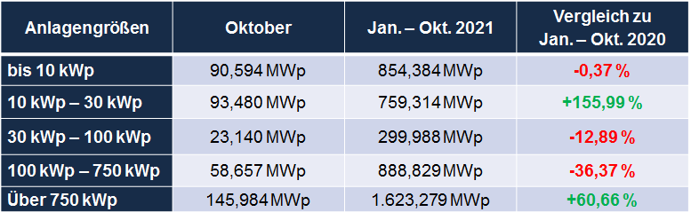 Der Gesamtzubau für 2021 liegt damit bisher bei knapp 4,426 GWp. Dies sind rund 500 MWp mehr als zur gleichen Zeit im Vorjahr (3,9 GWp) bzw. ein Plus von 13 %.