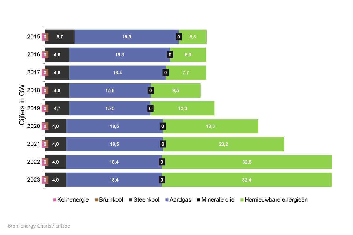 Netto-elektriciteitsproductie per energiebron in Nederland met de jaarlijkse verandering in 2023