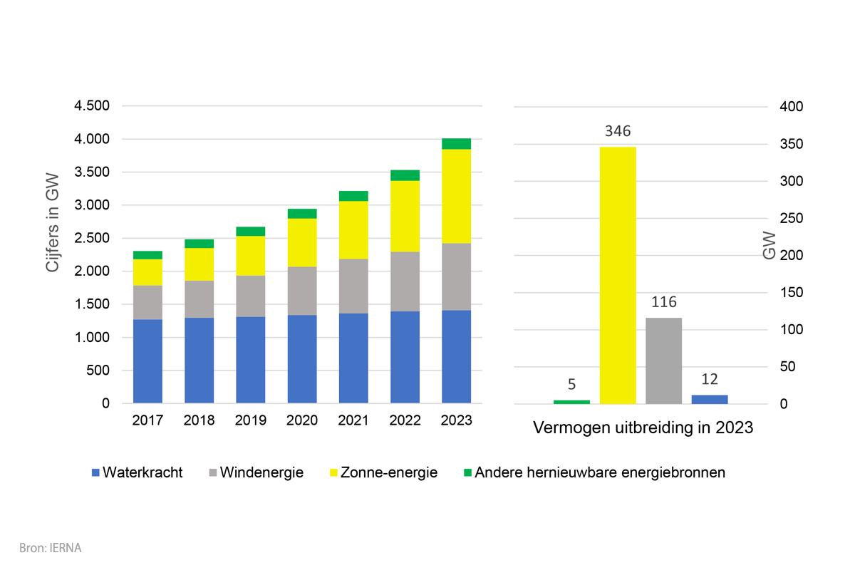 Wereldwijde uitbreiding van de capaciteit voor hernieuwbare energie per energiebron
