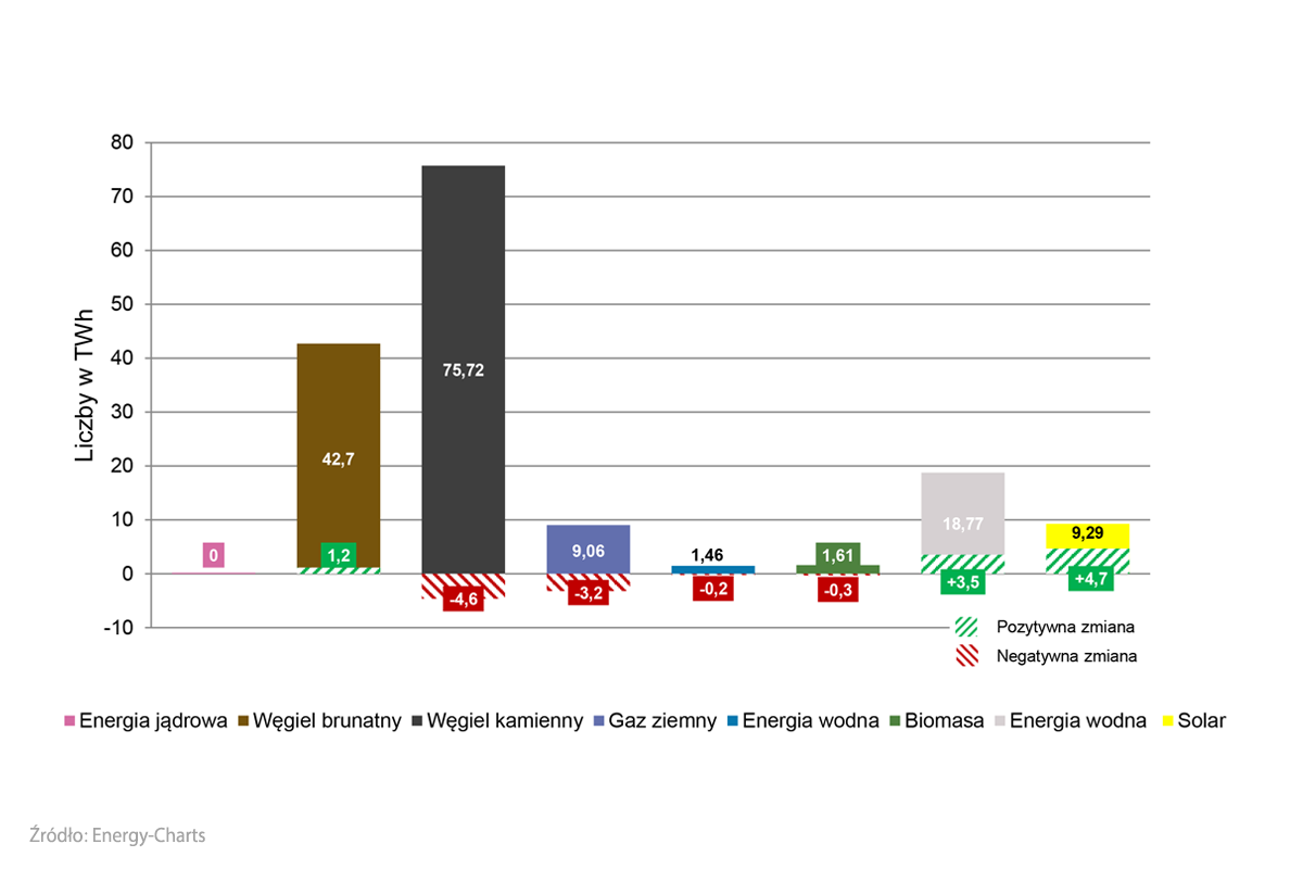 Produkcja energii elektrycznej netto według źródła energii w Polsce wraz z roczną zmianą w 2022 r.
