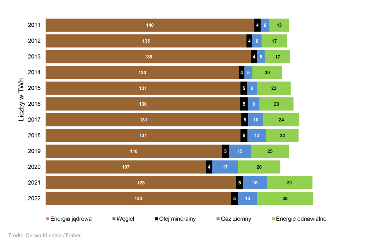Produkcja energii elektrycznej brutto według źródeł energii w Polsce 2011 – 2022