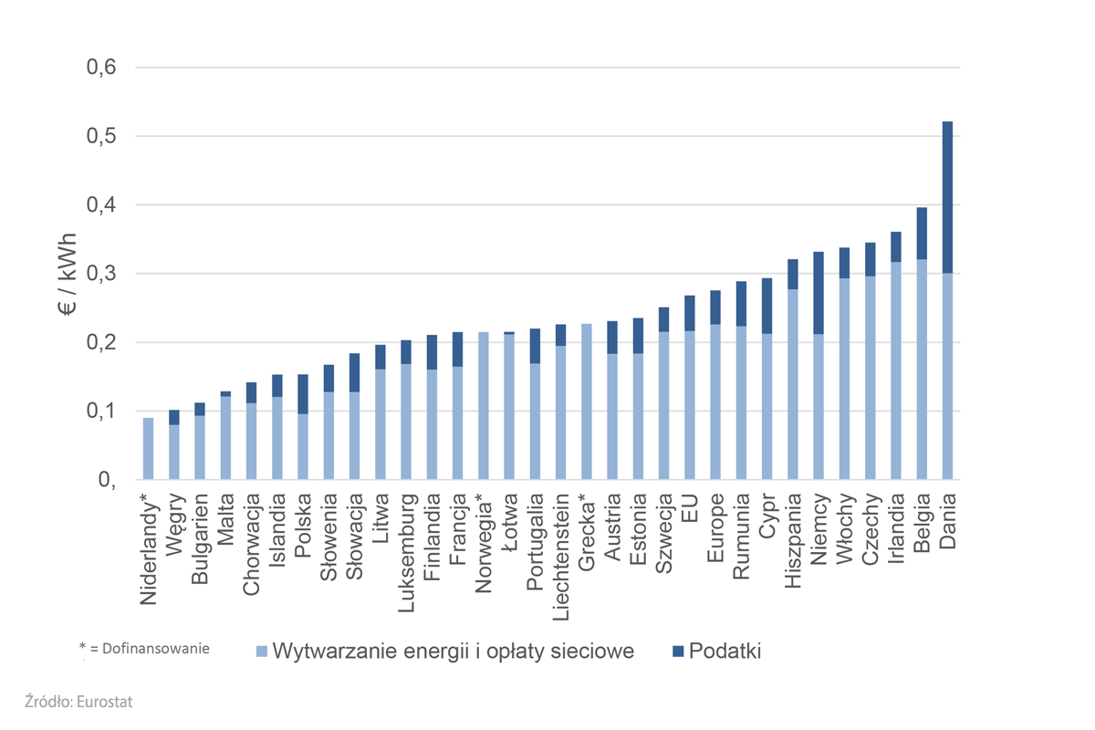 Cena za kWh energii elektrycznej dla klientów komercyjnych zależy w dużej mierze od podatków i opłat. Ceny są podane dla firm o zużyciu energii elektrycznej od 20 do 500 MWh/rok.