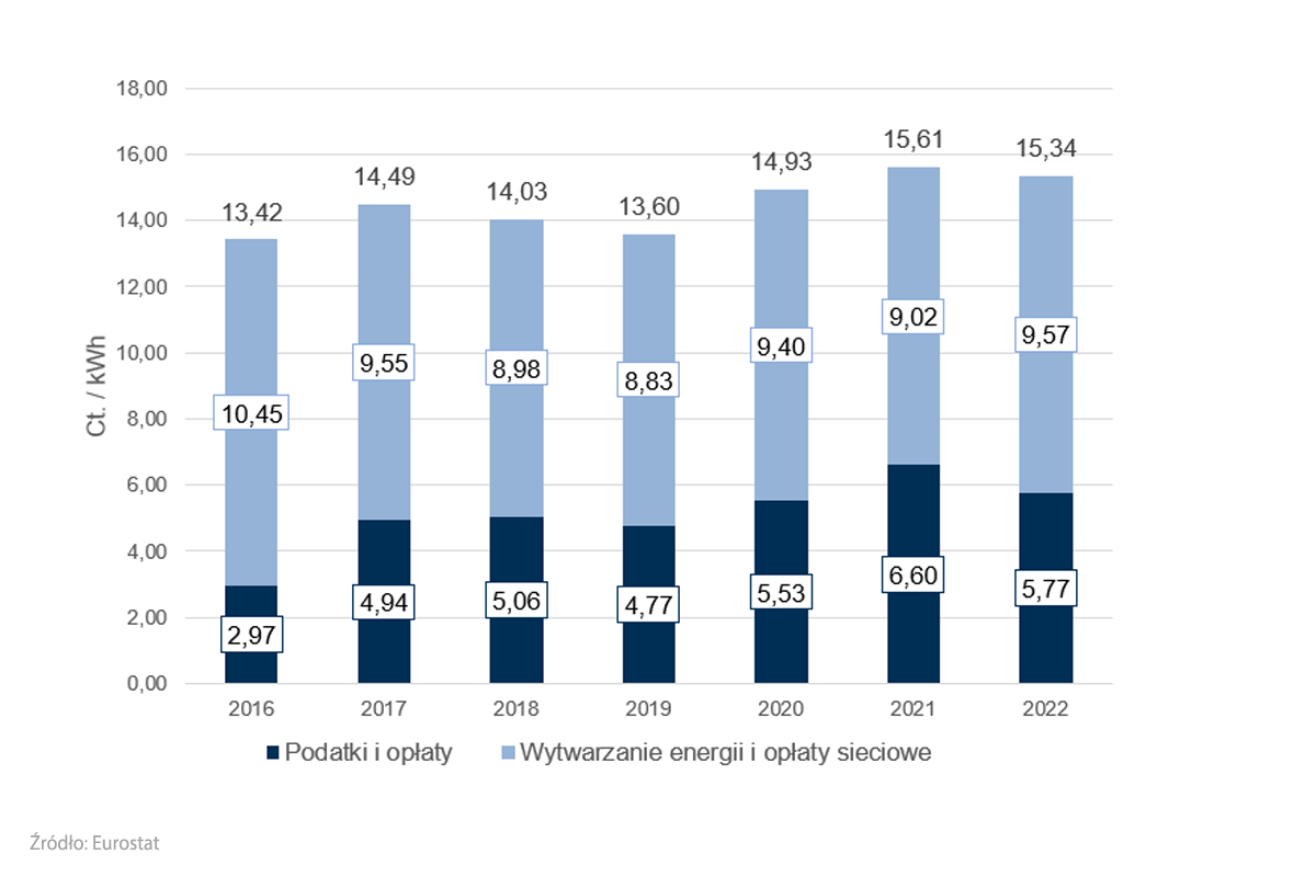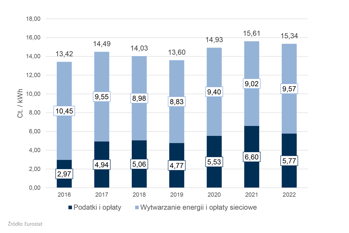Ceny energii elektrycznej dla prywatnych gospodarstw domowych w Europie (zużycie energii elektrycznej: 2500 - 5000 kWh/rok) wahały się od 9 do 52 centów/kWh w 2022 roku.