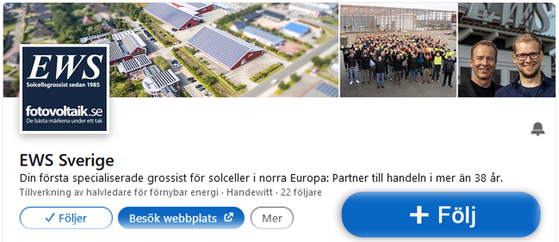 Snabbt, interaktivt, mångsidigt: Med vår företagssida på LinkedIn bygger vi vidare på vårt informationsutbud för våra svenska kunder inom sociala medier. Följ oss LinkedIn kanal ”EWS Sverige” och missa inte nyheter om EWS och våra starka varumärken. Naturligtvis rekommenderar vi att du fortsätter att följa vår företagskanal "EWS GmbH & Co. KG" på LinkedIn för att hålla dig informerad om vår verksamhet på den tyska och internationella marknaden.