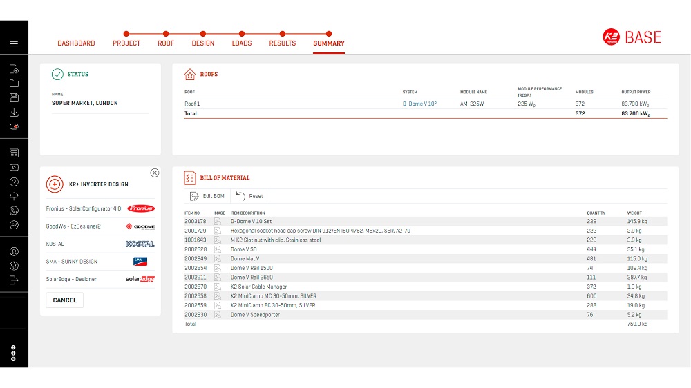 Med K2 Base, den kostnadsfria mjukvaran från K2 Systems, kan ni göra färdiga projekteringar inkl. installationsplan, statisk beräkningsrapport och artikellista med endast fem enkla steg. K2 Base erbjuder dessutom dataöverföring till designmjukvaror från många välkända växelriktartillverkare.