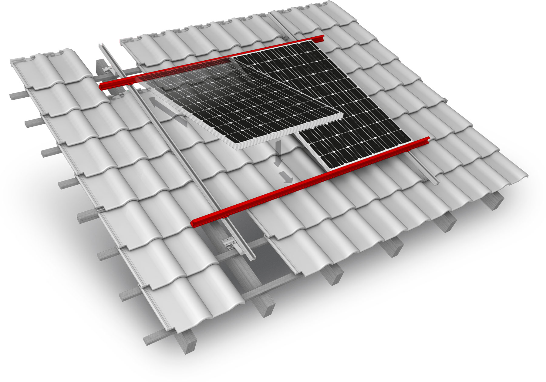The mounting system is suitable for roofing with pantiles, corrugated fibre cement or corrugated sheet metal. The most prominent feature: it does not use module clamps, thus enabling an easy and particularly fast installation. Several modules can be securely fixed between two insertion rails without the use of tools. The insertion system is fastened to the roof with the CrossHook 3S+, the CrossHook 4S+ or hanger bolts. Then, these will be connected with the AluVer mounting rail from ALUSTAND. Finally, the AluTec horizontal insertion rail is clicked into the pre-assembled ClickFix adapter.