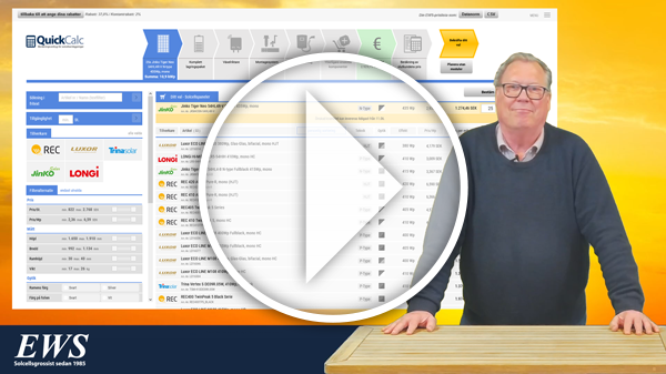 I en video sammanfattar vi hur QuickCalc 3.0 kan underlätta inköpsprocessen för solcellsinstallatörer. Förutom urvals- och filterfunktioner ligger programmets fokus på presentationen av produkttillgänglighet över tid. Som grossist erbjuder EWS sina kunder en unik planeringssäkerhet med upp till sex månaders framförhållning och därmed största möjliga säkerhet i denna del av leveranskedjan. Naturligtvis kan det nya beräkningsverktyget för kompletta system från EWS också användas för att komma överens om alla detaljer i fraktlogistiken, t.ex. leverans på önskat datum direkt till byggarbetsplatsen eller individuell beräkning av fraktkostnader.
